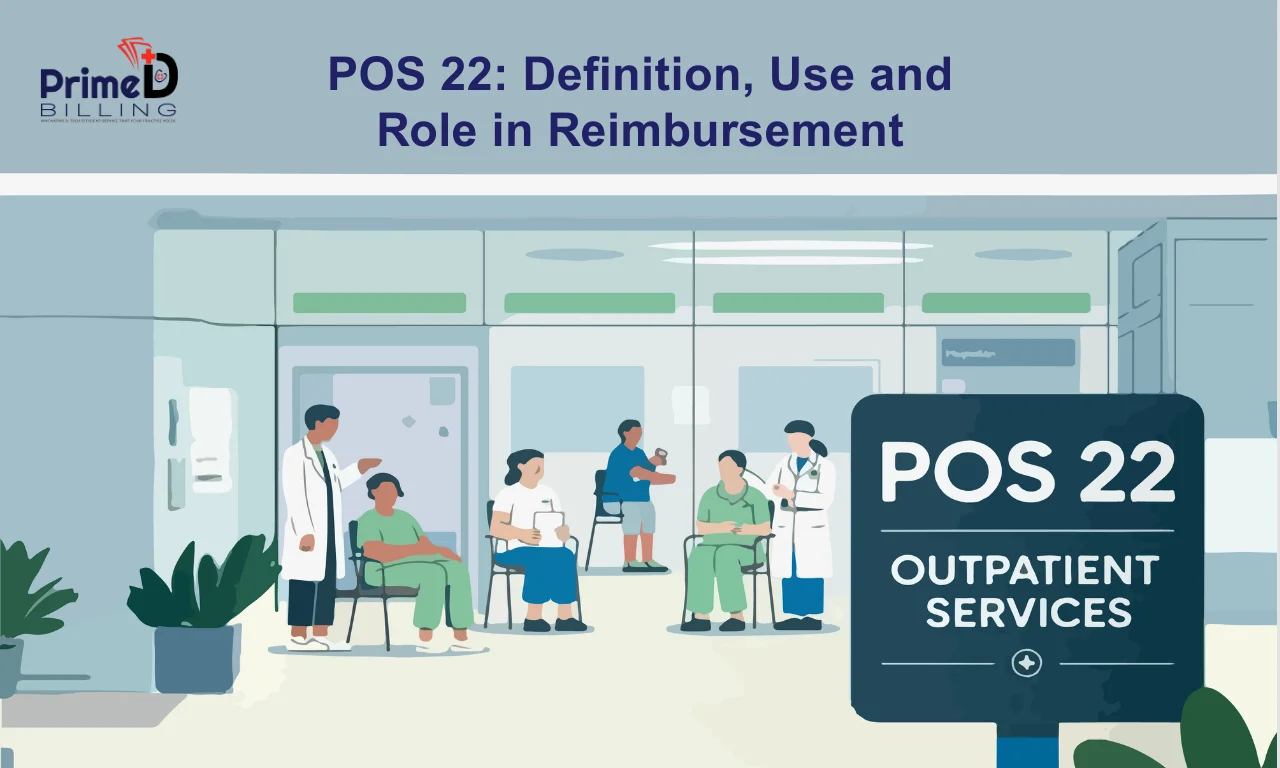According to the CMS (Centre for Medicare and Medicaid Services), POS code 22 is a portion of the main hospital’s campus where therapeutic, rehabilitation and diagnostic services are provided to outpatients. The place of service code 22 is important in medical billing because the Medicare, Medicaid and other state-specific insurance companies adjust reimbursement rates according to the outpatient location.
