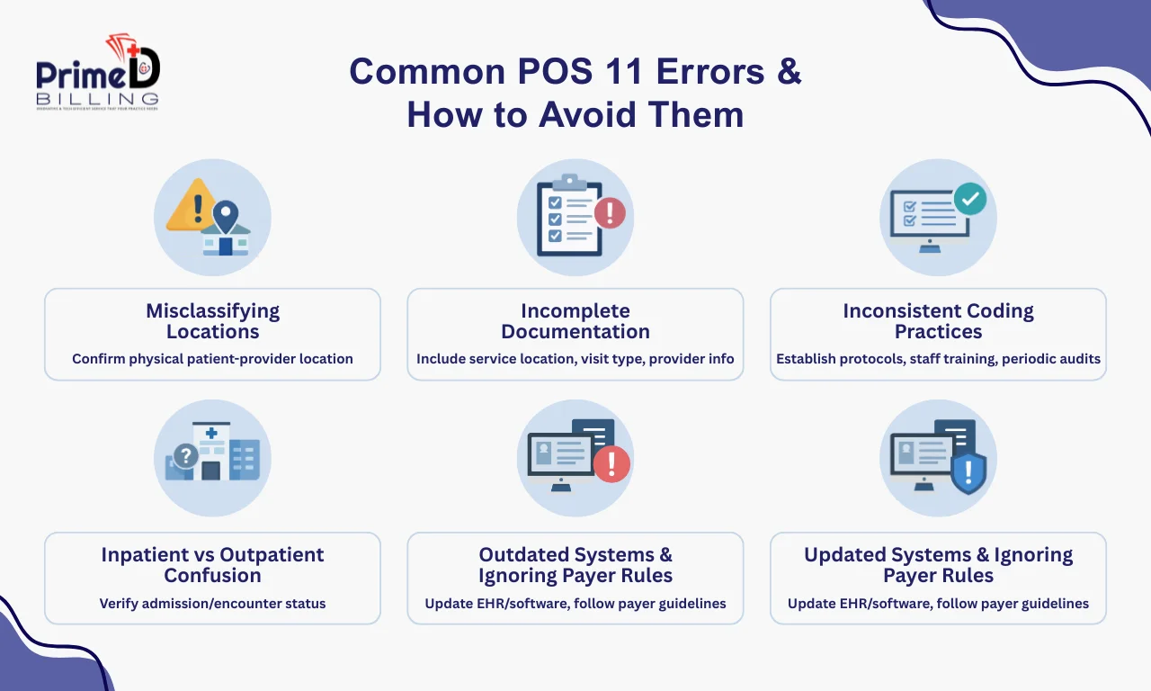 The following are the common POS 11 errors, along with a solution for how to avoid them in medical billing:
